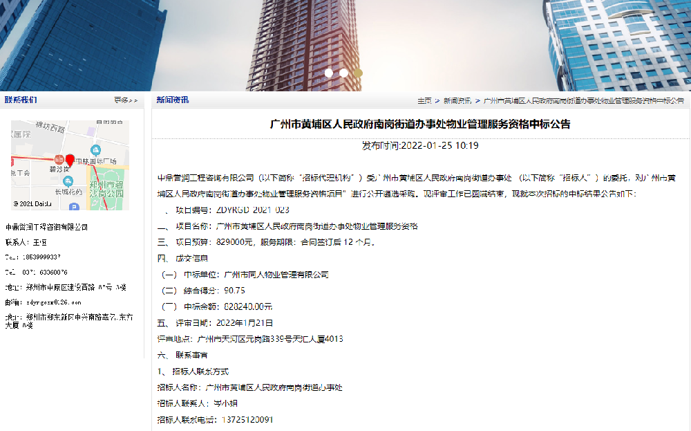 鼎點娛樂工程咨詢有限公司(以下簡稱“招標(biāo)代理機構(gòu)”)受廣州市黃埔區(qū)人民政府南崗街道辦事處 (以下簡稱“招標(biāo)人”)的委托,對廣州市黃埔區(qū)人民政府南崗街道辦事處物業(yè)管理服務(wù)資格項目”進行公開遴選采購,F(xiàn)評審工作已圓滿結(jié)束,現(xiàn)就本次招標(biāo)的中標(biāo)結(jié)果公告如下:一、項目編號:ZDYRGD-2021-023二、項目名[詳細]